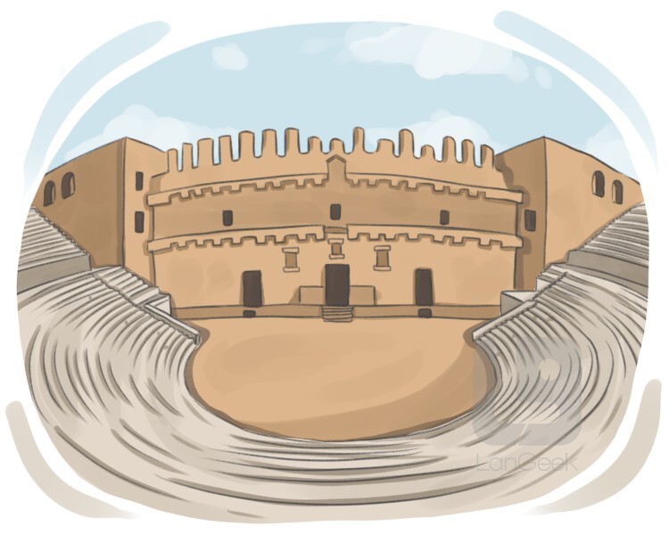 an open building that is round or oval in shape and has a space in the middle surrounded by several seats, originated in ancient Roman and Greek architecture used for public entertainments such as sports or drama